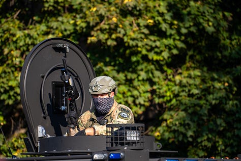 Throughout the video, drones capture footage of the crowd. The FAA ordered a 12 day ban on drones in the area, beginning October 1, meaning the drones are part of DHS’s campaign. At 4:49, a drone buzzes around as agents hang off of a Bearcat, driving by protesters and single family homes (the Bearcat drove down the block, before turning around and returning to the facility).