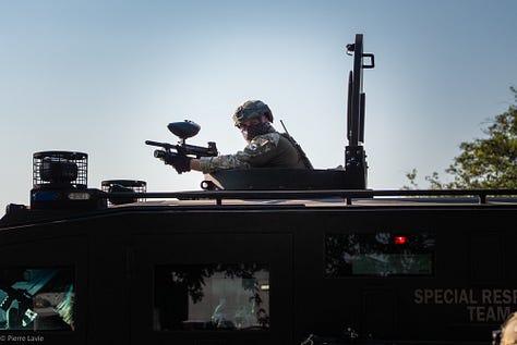 But in Broadview, I have been privy to a front row seat for DHS’s rehearsals. Under the direction of chief patrol agent Greg Bovino, agents have coordinated dramatic openings and closings of the controversial (and possibly illegal) fence that separates the facility from protesters. One photographer told me that, after asking who he was shooting for, Bovino seemed to intentionally pose himself for the photographer’s camera throughout the nice.